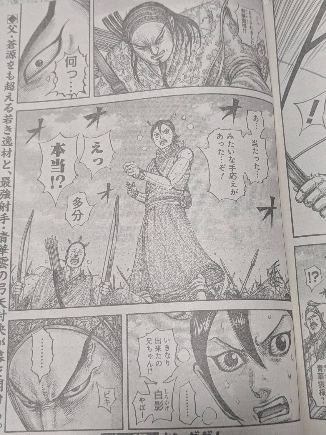 キングダム860話は飛信隊が誇る弓矢兄弟に青華雲が「白影」という存在しない矢で攻撃し2人は首とこめかみを撃たれた気持ちになりその後吐きげすらもよおすほどの精神的ダメージを与えられ、しかしその後に弓矢兄弟の兄が同じ「白影」で青華雲のこめかみを撃ち抜き青華雲が驚いてもいるようなブチ切れてもいるような表情になっているシーンで終わりました。