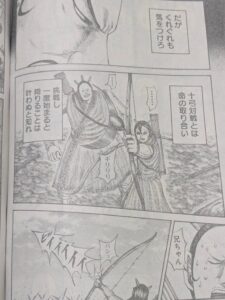 仁は今相対している弓使いは父よりも自分たちよりも上だと言いそんな奴が李信将軍を狙えばどうなると思うと淡に言いここで自分たちが相手の弓使いを倒さなければいけないと言うのでした。